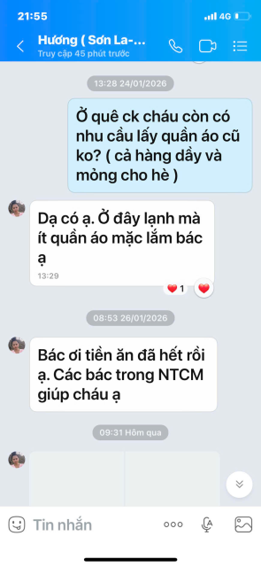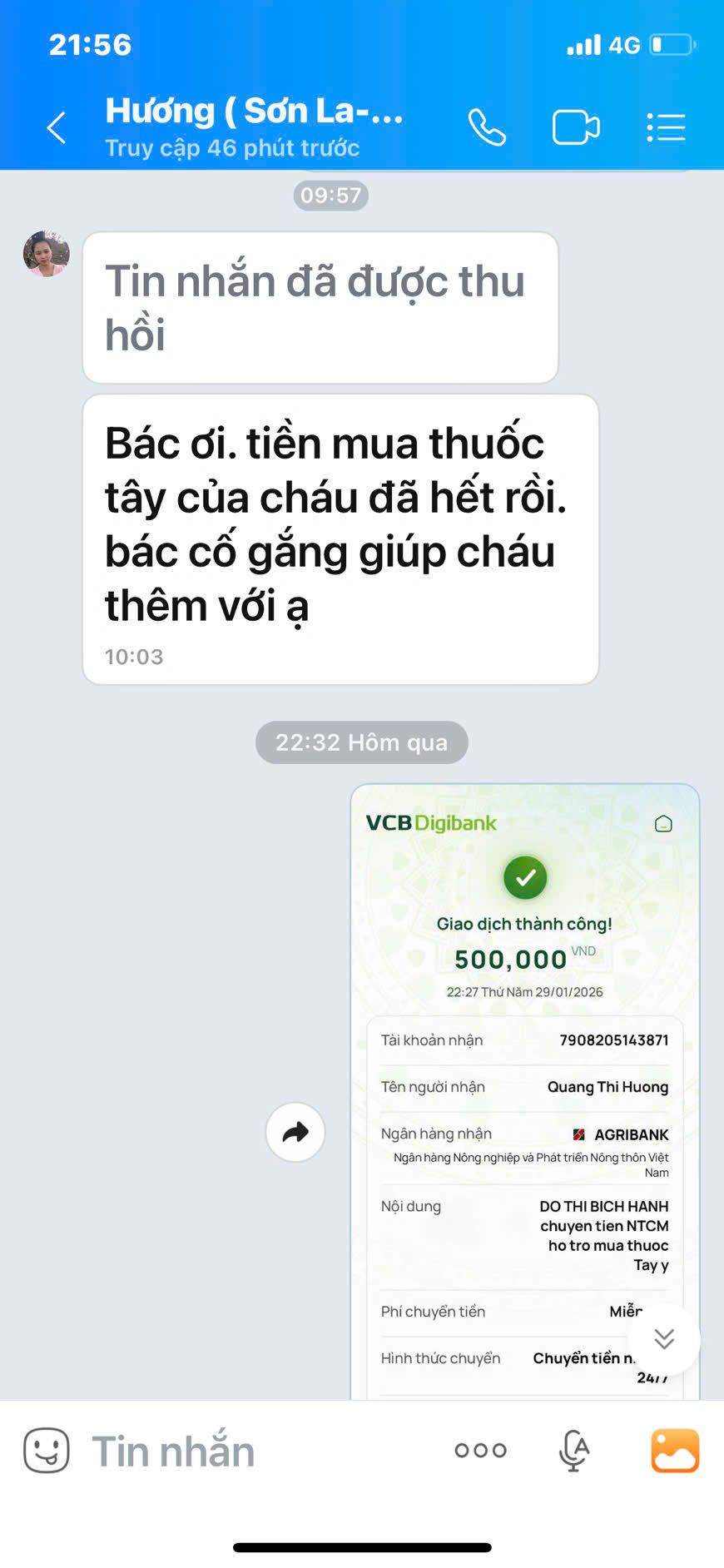 HBL nhận được tin nhắn của cháu Hương xin được giúp đỡ tiếp tiền mua thuốc Tây, mua thuốc Lá và tiền mua thực phẩm.