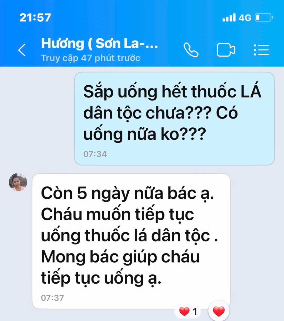 Ngày 1/11/2025, sau khi uống hết thuốc Nam do HBL mua ở Vĩnh Phúc thì cháu xin được tạm dừng để uống thuốc LÁ do người dân tộc vùng cháu bán.