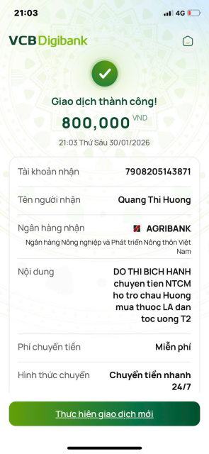 Ngày 29 và 30/01/2026. HBL đã ck cho cháu Hương:
