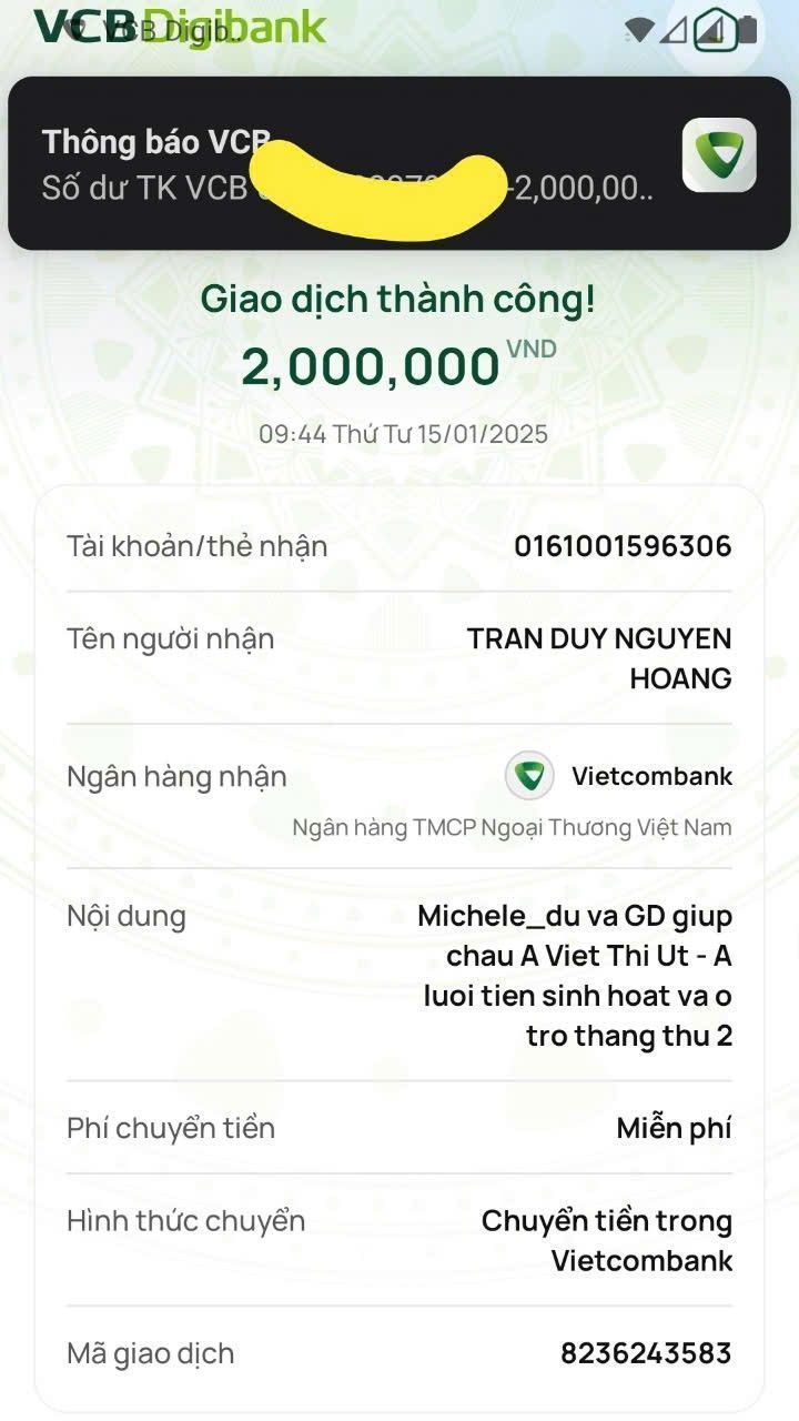 Michele_du cũng đã chuyển 2,000,000₫ tiền ở trọ cùng sinh hoạt phí tháng thứ 3 cho cháu ấy.
