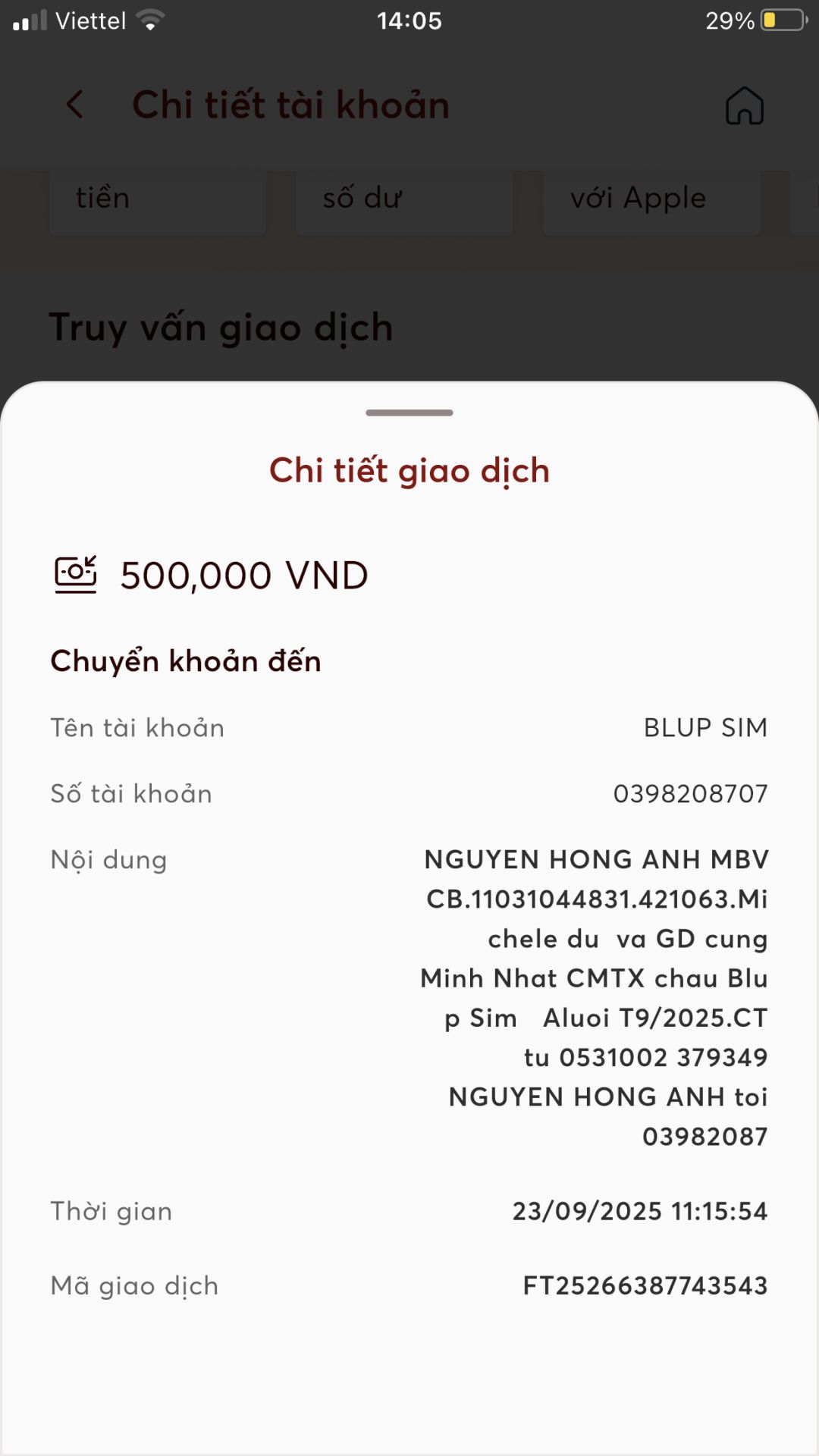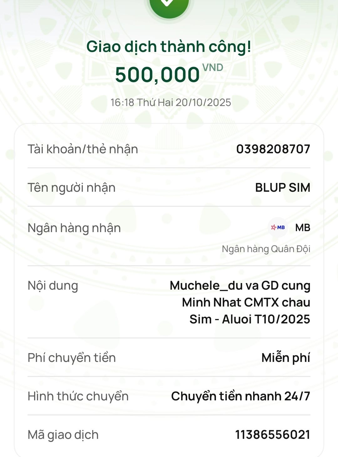 Tiền CMTX cháu @Blup_sim tháng 10/2025 từ Michele_du và Gia đình cùng Minh Nhật đã chuyển các bạn nhé.
