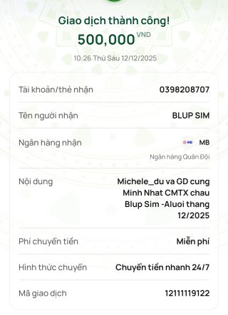 Tiền CMTX cháu @Blup_sim tháng 10/2025 từ Michele_du và Gia đình cùng Minh Nhật đã chuyển các bạn nhé.