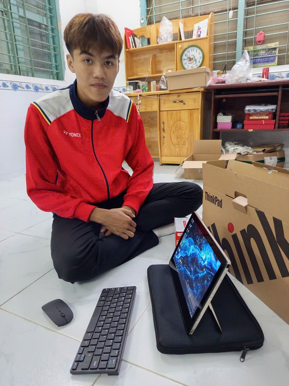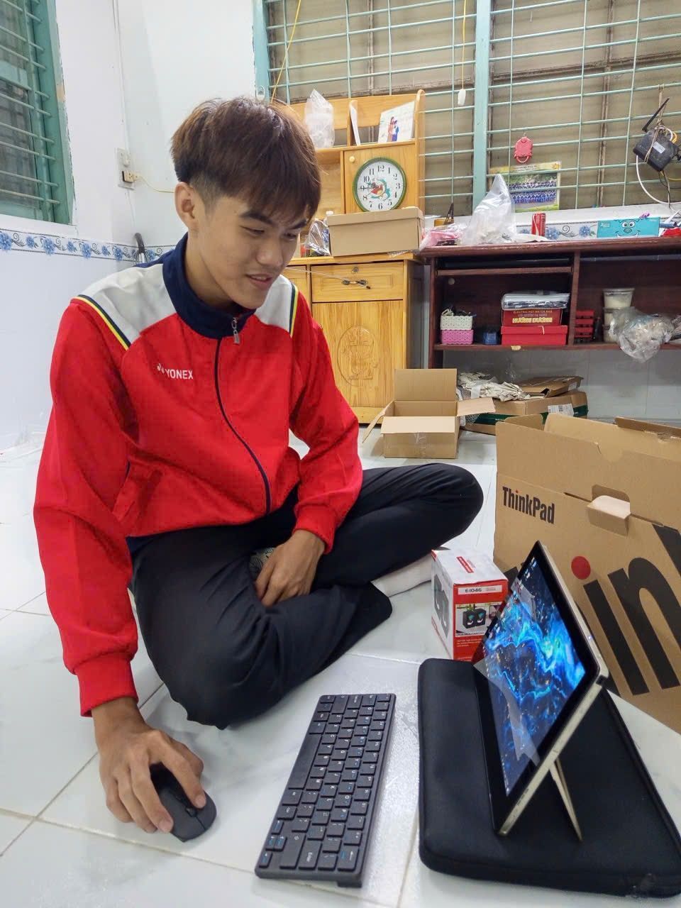 6x đã trao cho cháu Phước máy tính rất gọn nhẹ với màn hình cảm ứng.