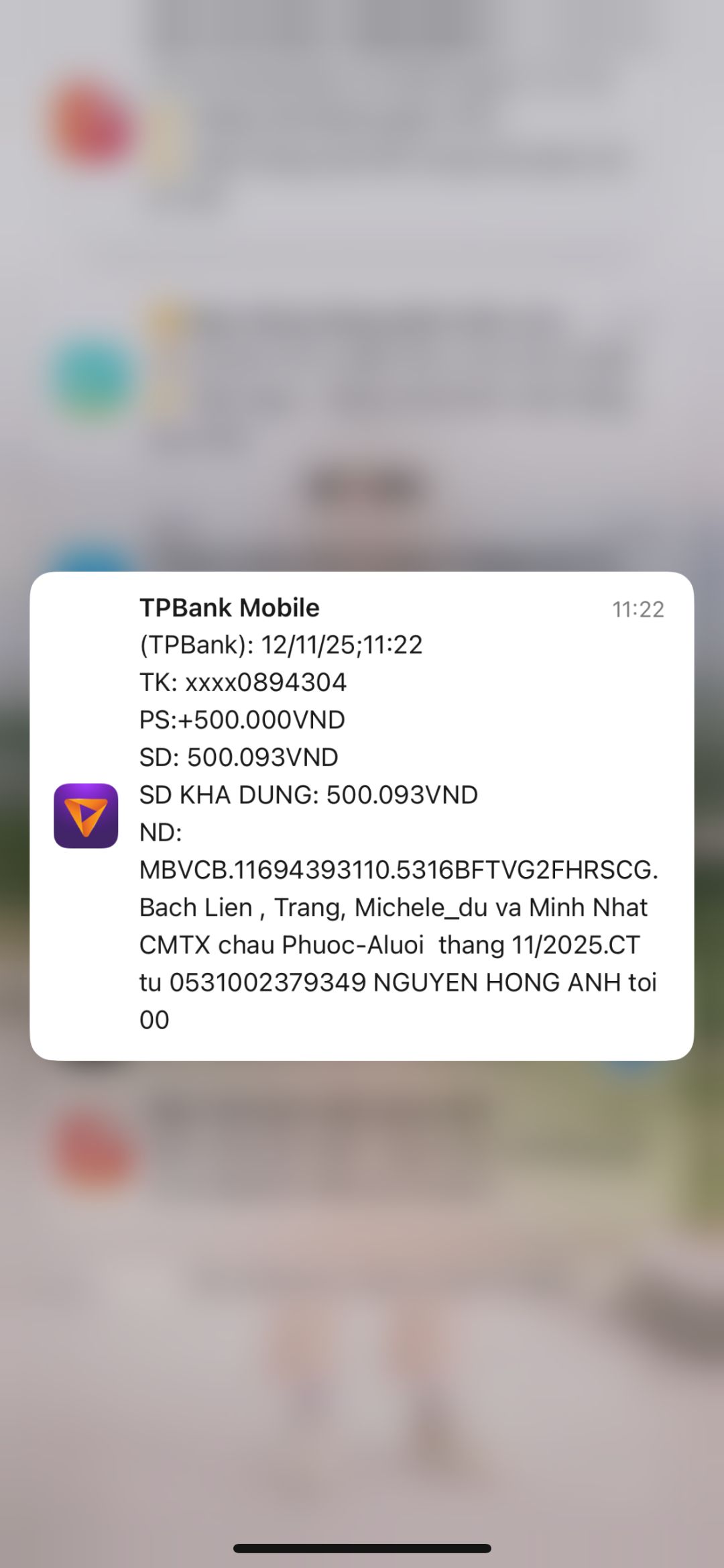 Bạch Liên, Trang, Michele_du và Gia đình cùng Minh Nhật gửi 500,000₫ tiền CMTX cháu @Phuocpham tháng 12/2025.