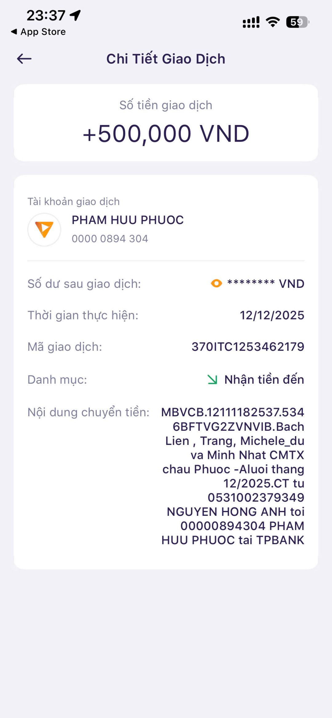 Bạch Liên, Trang, Michele_du và Gia đình cùng Minh Nhật gửi 500,000₫ tiền CMTX cháu @Phuocpham tháng 12/2025.