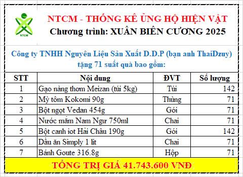 Công ty TNHH Nguyên Liệu Sản Xuất D.D.P (bạn anh ThaiDzuy) tặng 71 suất quà, tổng trị giá 41.743.600 đ