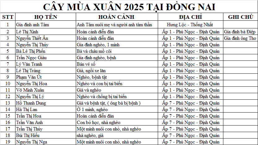 Ở trên chương trình đã đưa ra danh sách 19 hoàn cảnh trong CMX năm 2025, và đã khảo sát 1 số trường hợp trên, có 19 trường hợp trong đó có 4 trường hợp mà diễn đàn mình đã giúp đỡ: Hưng Lộc, Thống Nhất - Anh Tâm nuôi mẹ và người anh tâm thần ; Phú Ngọc, Định Quán - GĐ ông Tho - Nghèo khổ sống trên bè ; Đồng Nai (Định Quán) - NNMU15 - Chị Hoa một mình nuôi con nhỏ ; Đồng Nai (Định Quán) - Cô Điệp - Cần hỗ trợ mai táng