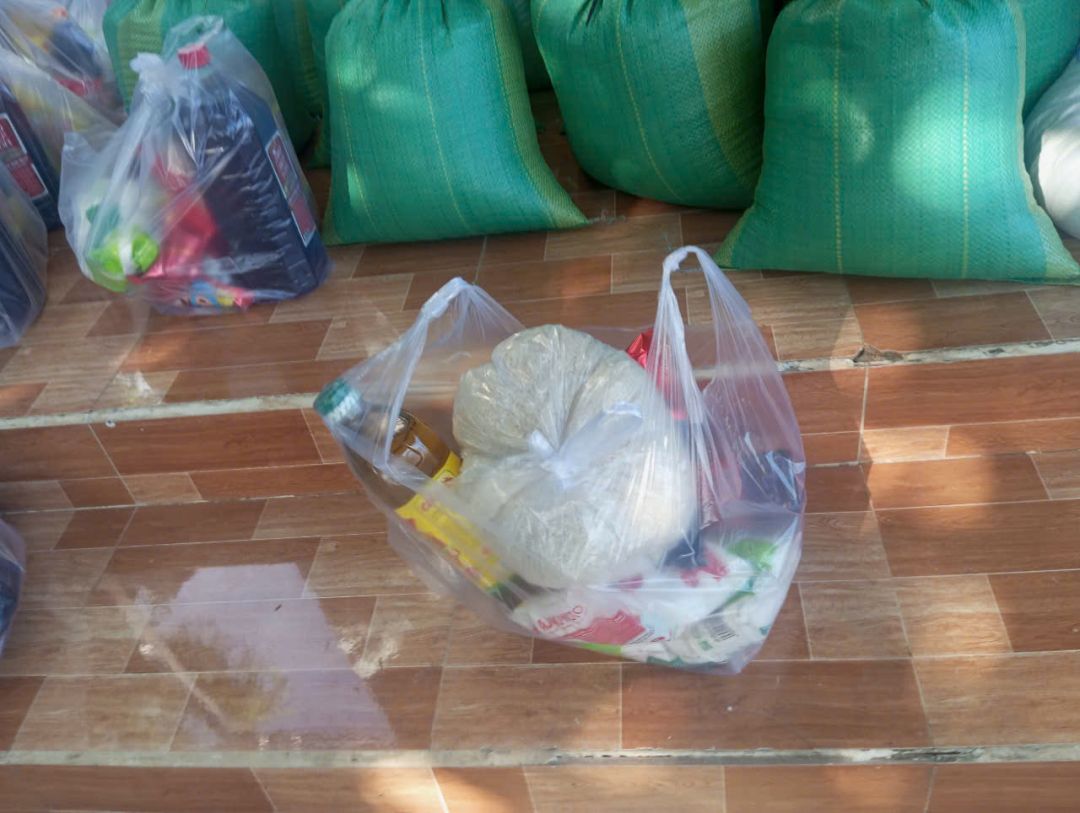 Công tác chuẩn bị tập kết gạo, nhận nhu yếu phẩm và sắp xếp phần quà tại nhà anh Tuấn Anh nguyên là ấp trưởng ấp 1, gia đình anh Tuấn Anh tự phân chia quà tại nhà dùm .
