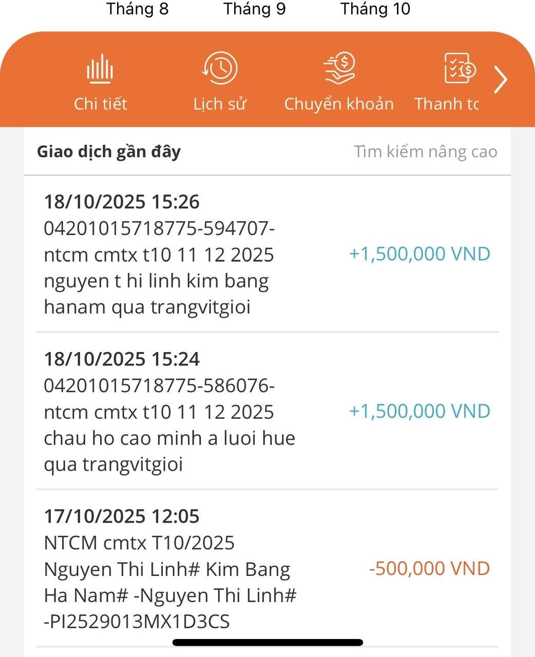 Quỹ đã chuyển 1.500.000đ cmtx 3 tháng vào tk Vịt, đồng thời Vịt đã chuyển cmtx tháng 10 vào tk em Linh, kiểm tra giùm chị nha. Thanks.
