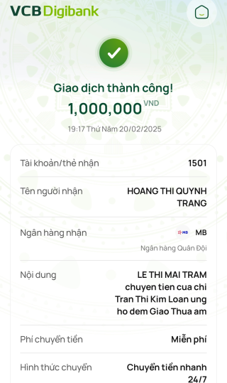 Xin lỗi Cả Nhà ❤️ Mai Trâm Quên chuyển tiền của Chị Trần Thị Kim Loan ủng hộ cho đêm giao thừa ấm 1triệu.