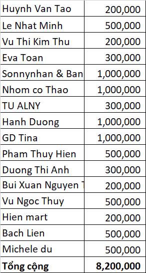 Tổng ủng hộ MTTT Em Quyết đến sáng nay là 8.200.000đ và Quỹ đã chuyển cho chị Haybanglong. .....