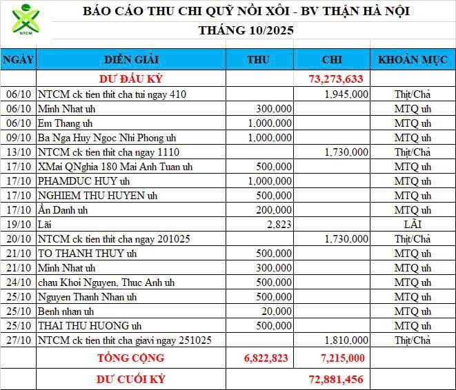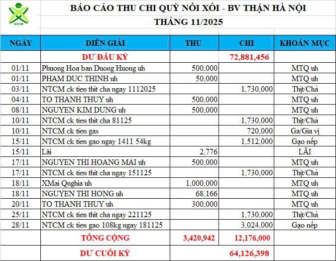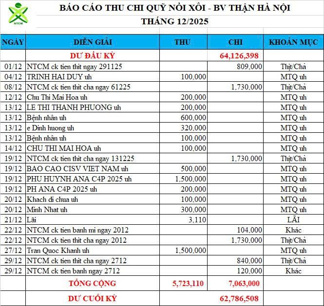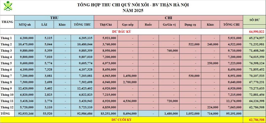 Re: Nồi Xôi - Bệnh viện Thận Hà Nội - Thống kê cưu mang, Báo cáo thu chi năm 2025