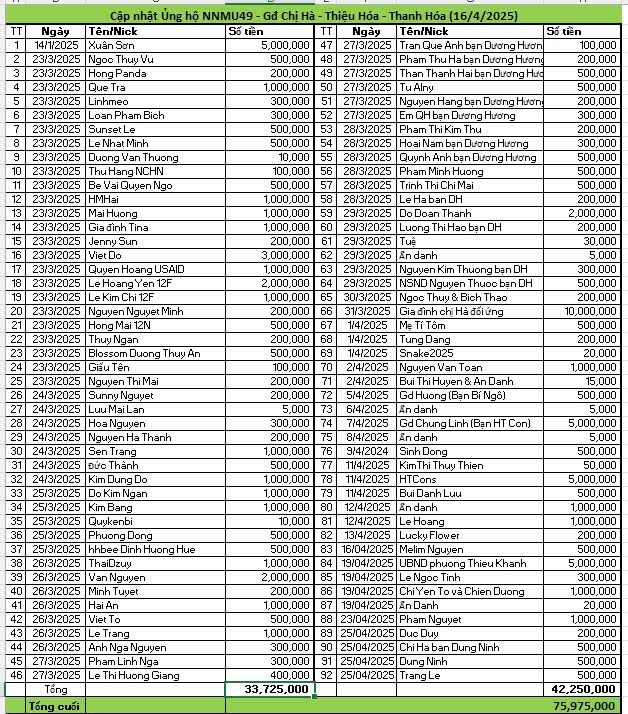 Số tiền ủng hộ NNMU49 của chị Hà tính tới thời điểm hiện tại là:75.975.000đ( Bảy mươi lắm triệu, chín trăm bảy mươi lăm ngàn đồng chẵn). Cảm ơn cả nhà đã chung tay.