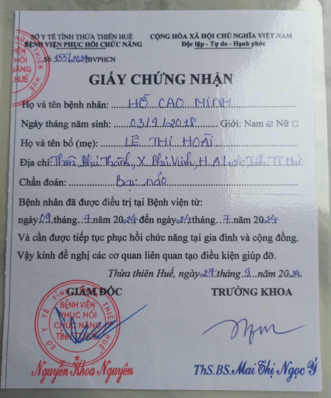 Cháu Hồ Cao Minh bị bệnh viêm não từ nhỏ do bệnh quá nặng nên cháu không nói được, đi không được,cháu chỉ bò và ngồi một chỗ, tay cháu vận động yếu, phải nhờ đến mẹ giúp đỡ về việc ăn uống và sinh hoạt hàng ngày.Mỗi tháng em về Bệnh viện Trung ương Huế tái khám.tiền thuốc và xe cộ đi lại gần 1 triệu . em được nhà nước hỗ trợ một tháng 1.200k mỗi tháng gồm trợ cấp cho cháu và tiền cho người chăm sóc cháu
