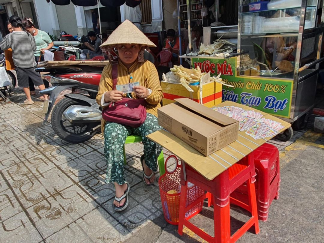 May mắn lần đến này gặp đúng lúc chị đang đi ra điểm bán vé số của 2 mẹ con.