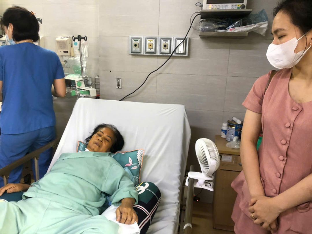 Con gái chị nghỉ làm công nhân để 1 mình chăm sóc chị ở bv. Chị mới bỏ ống thở ở cổ họng lúc chiều 28/4, trí não tỉnh, mới uống được chút sữa.
