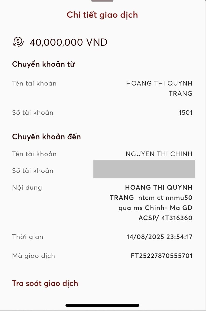 Quỹ đã thực hiện chuyển tiền Chị Chính vào ngày 14/8. Nhờ chị kiểm tra và xác nhận giúp nhé. Thanks.