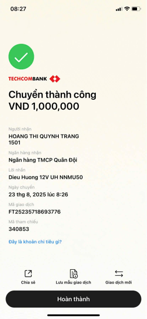 Quỹ đã thực hiện chuyển tiền Chị Chính vào ngày 14/8. Nhờ chị kiểm tra và xác nhận giúp nhé. Thanks.