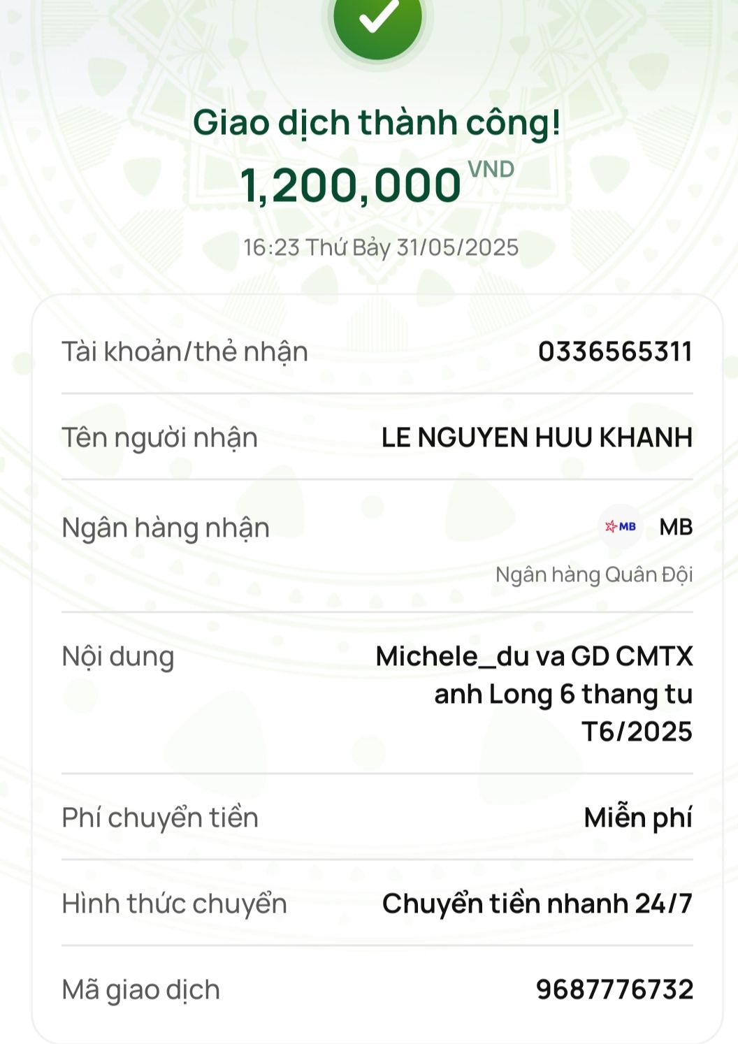 Cảm ơn @huukhanh đã nhận việc trung chuyển tiền !