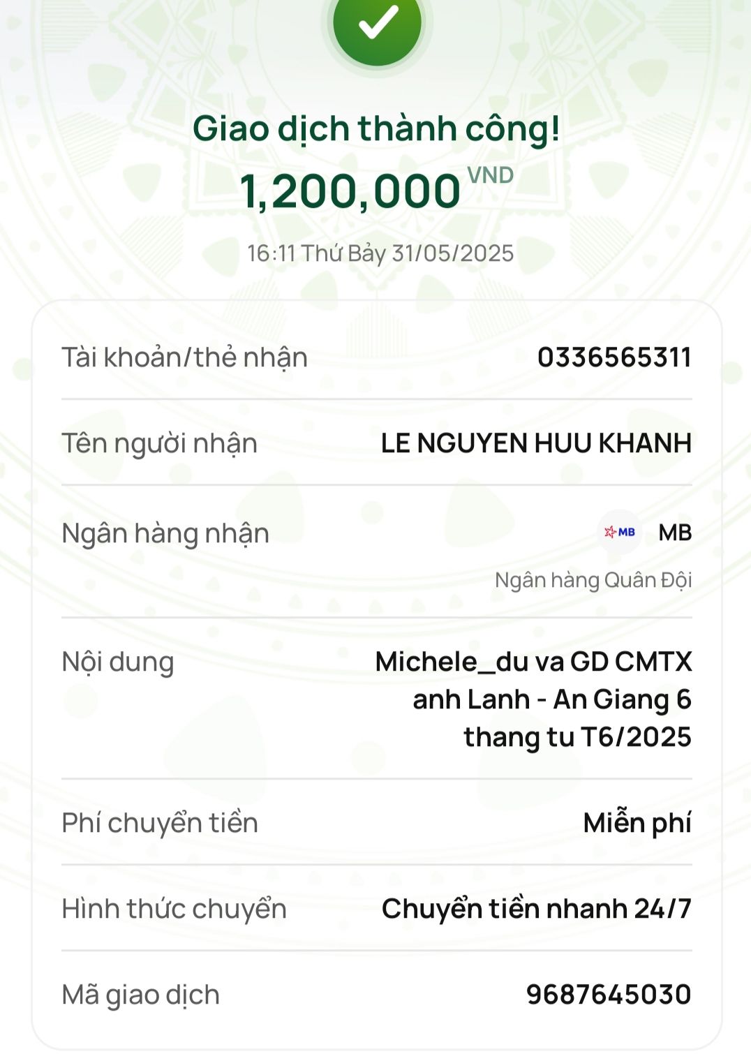 Michele_du và Gia đình đăng ký CMTX  anh Lãnh 200,000₫/tháng từ tháng 6/2025 trước mắt trong thời gian 6 tháng các bạn nhé.