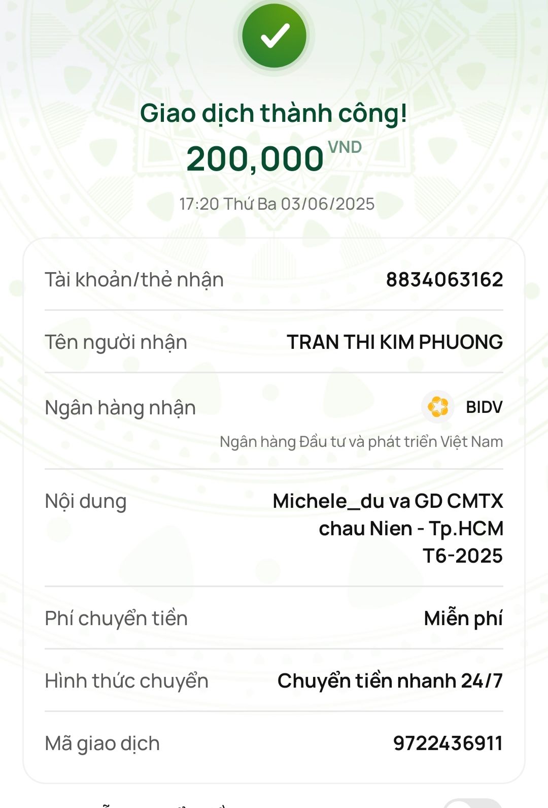 Michele_du và Gia đình mới chuyển tiền tới tài khoản cá nhân của chị Phượng.