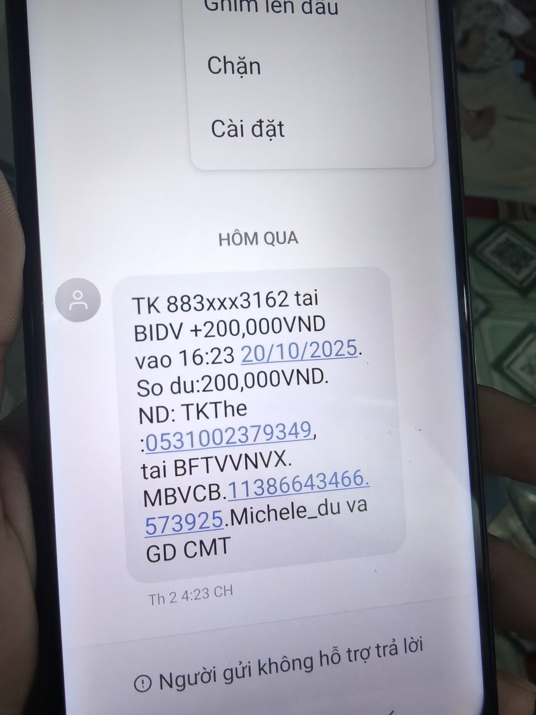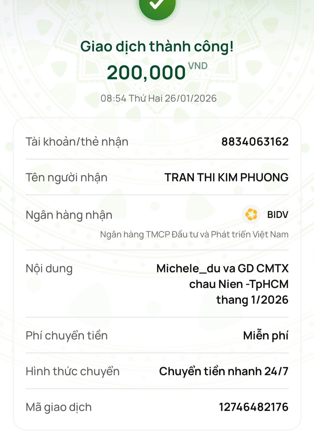 Cháu xin cập nhật vào ngày 13/12/2025 bà Phượng đã nhận được 200.000vnd từ Michele_du và gd ạ !