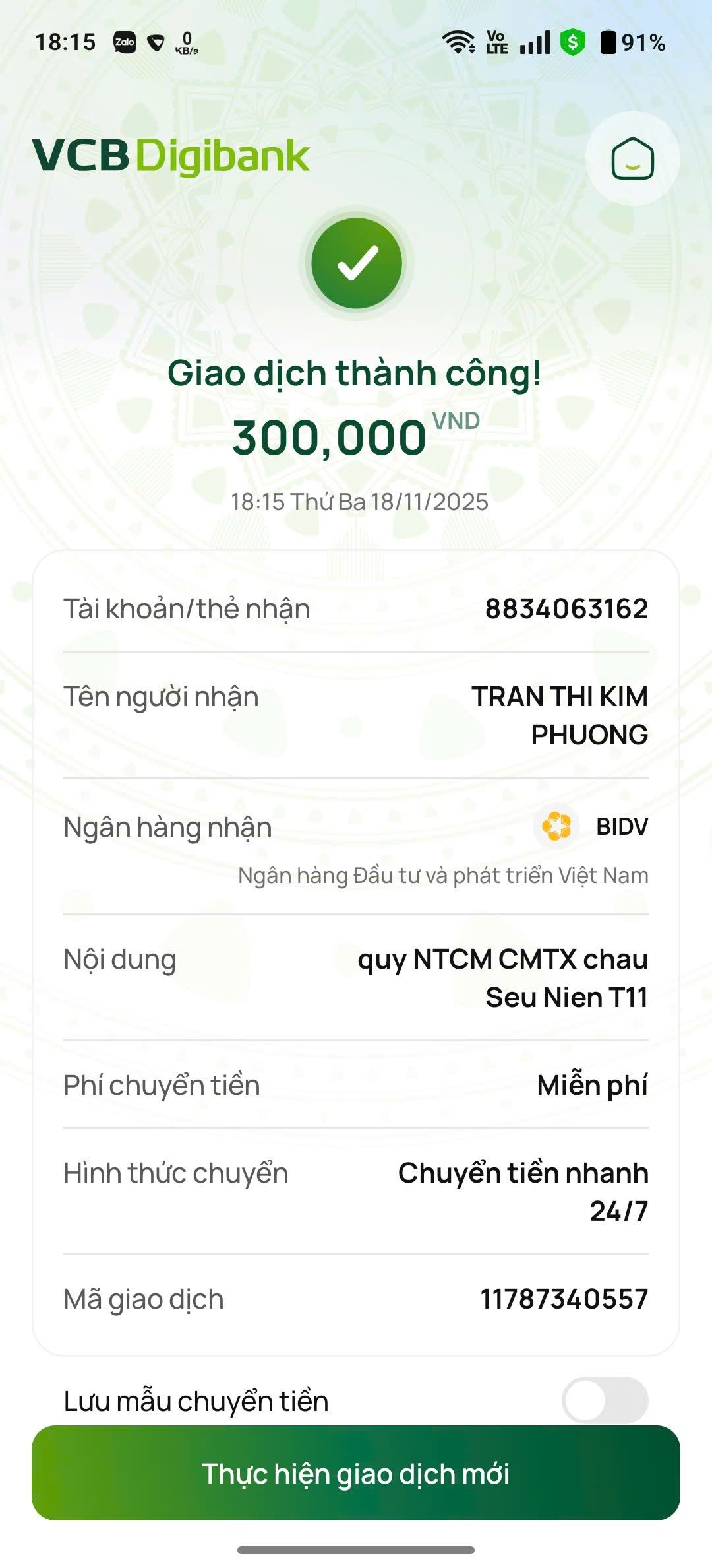 Tiền CMTX tháng 11/2025 từ Michele_du và Gia đình đã chuyển đến dì của cháu Nien.