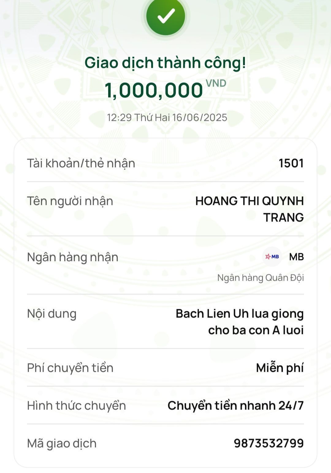 Trong những ngày vừa qua, cơn bão số 1 đã đổ bộ vào nhiều tỉnh miền Trung, trong đó có xã Hồng Thuỷ – gây thiệt hại nặng nề đến đời sống và sản xuất của người dân, đặc biệt là bà con nông dân nghèo. Nhiều diện tích lúa vừa mới gieo sạ đã bị cuốn trôi, ngập úng hoặc hư hại hoàn toàn, khiến hàng trăm hộ gia đình rơi vào cảnh trắng tay, đối mặt với nguy cơ thiếu lương thực trong thời gian tới. Bà con nhân dân xã Hồng Thuỷ kính mong nhóm thiện nguyện “Người tôi cưu mang” góp sức hỗ trợ kinh phí mua giống lúa, giúp bà con có cơ hội khôi phục sản xuất, ổn định cuộc sống sau thiên tai. Mọi sự đóng góp, dù ít hay nhiều, đều là nghĩa tình quý báu, góp phần đem lại hy vọng và niềm tin cho những hoàn cảnh khó khăn