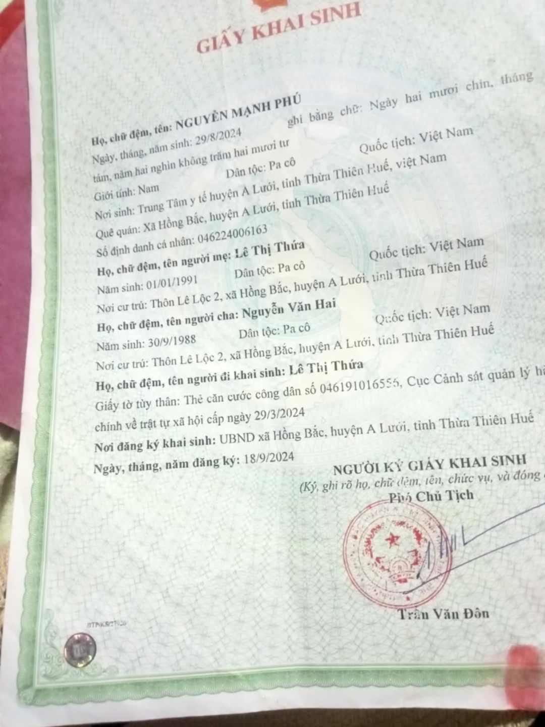 Ba của cháu tên là Nguyễn Văn Hai, mẹ cháu tên là Lê Thị Thứa, đều trú tại thôn Lê Lộc 2, xã Hồng Bắc, huyện A Lưới, thành phố Huế.