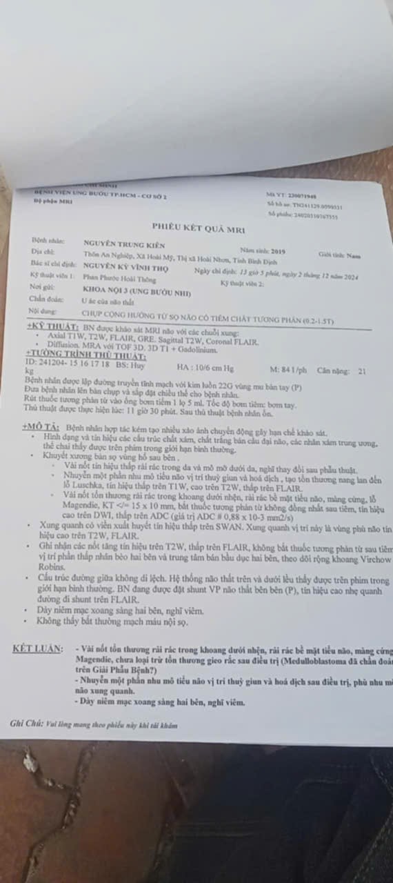 Cháu bị phát hiện U ác não thất vào năm 2023. Lúc đó cháu 4 tuổi gia đình đưa vào điều trị và mổ 1 lần tại BV Nhi đồng 2 (Lý Thái Tổ). Sau mổ cháu được chuyển qua BV Ung Bướu xạ trị vừa hết liệu trình vào khoảng 7 tháng trước, tình trạng lúc đấy của cháu cũng tạm thời ổn định, cái khối u lặn đi nhiều. Từ 1 em bé lanh lợi kháu khỉnh cháu trở thành đứa bé xanh xao, đầu rụng hết tóc do xạ trị, cháu không thể đi lại được nữa, chỉ có thể lếch dưới nền nhà, sau xạ trị sức khỏe cháu xuống đi nhiều nhưng cũng tạm ổn định, cháu không nói được chỉ kêu ú ớ và tiếng:  ba mẹ, ăn, uống....