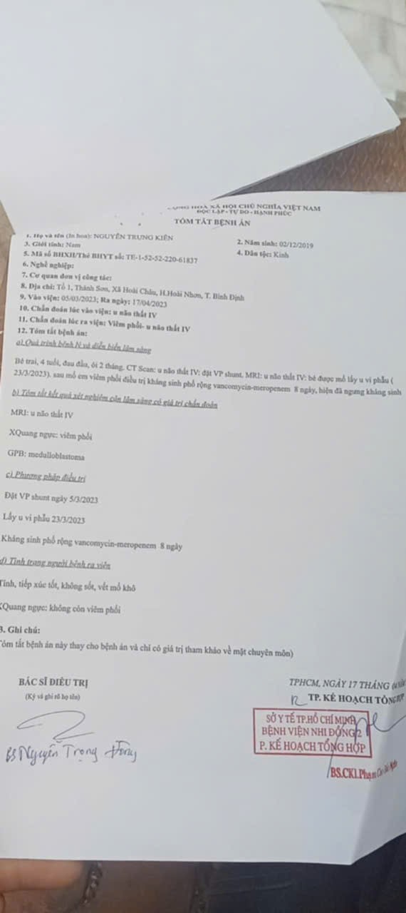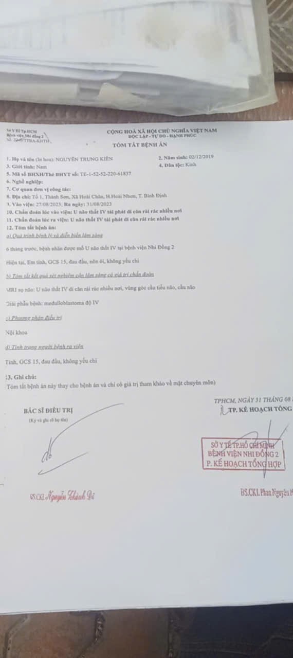 Sau hơn 2 năm điều trị gia đình cháu cũng kiệt quệ, chi phí chữa bệnh đã đến con số hơn 700 triệu đồng, ba mẹ cháu cũng dùng hết tiền tích cóp và vay mượn thêm rất nhiều, ba cháu là Nguyễn Văn Thân sinh năm 1992 làm nghề đi biển, mẹ cháu là Nguyễn Thị Phước sinh năm 1995 ở quê chăn nuôi nhưng đợt dịch vừa rồi heo bị tiêu hủy hết, nên giờ không còn tiền đưa cháu vào HCM điều trị.