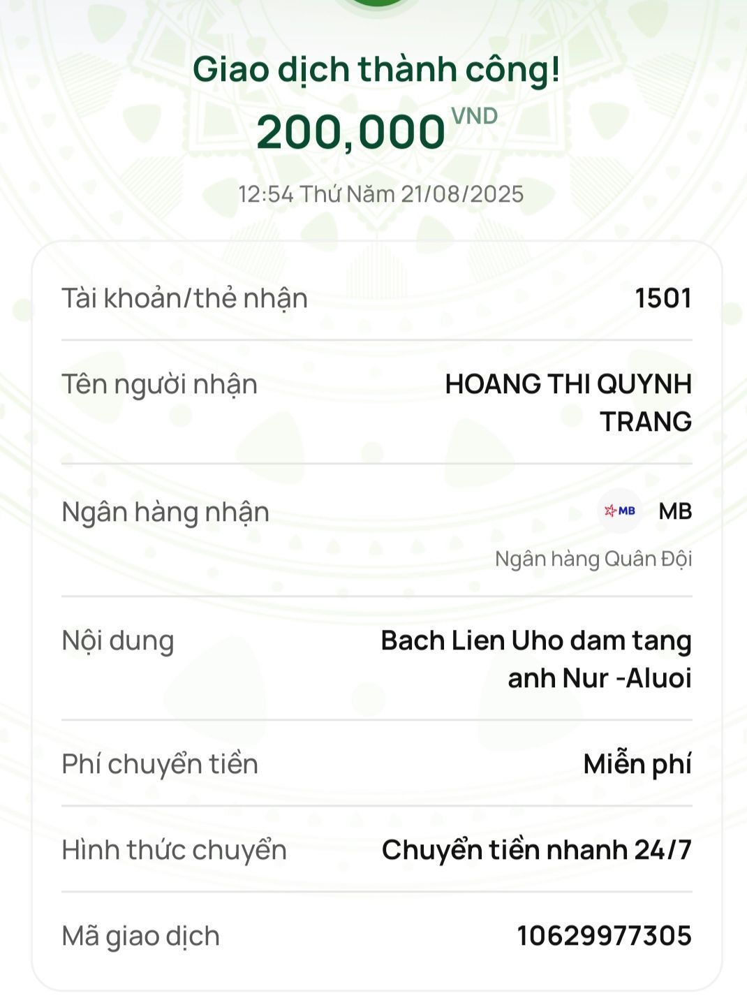 Tài khoản của bạn @Pi Riu Thế gặp sự cố nên bạn ấy có nhắn cho @letuantu  thông tin tài khoản của con dâu anh Nur tên Hồ Thị Thắm để chúng ta chuyển tiền trực tiếp tới người thân trong Gia đình anh ầy.