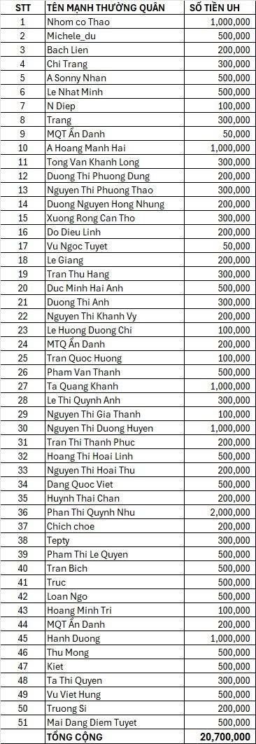 Quỹ đã thực hiện. Nhờ Pi Riu Thế nhắn gia đình kiểm tra tài khoản nhé.