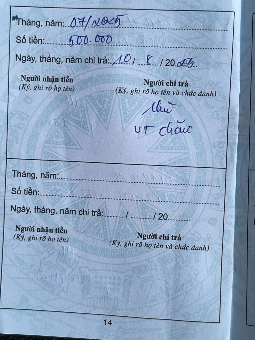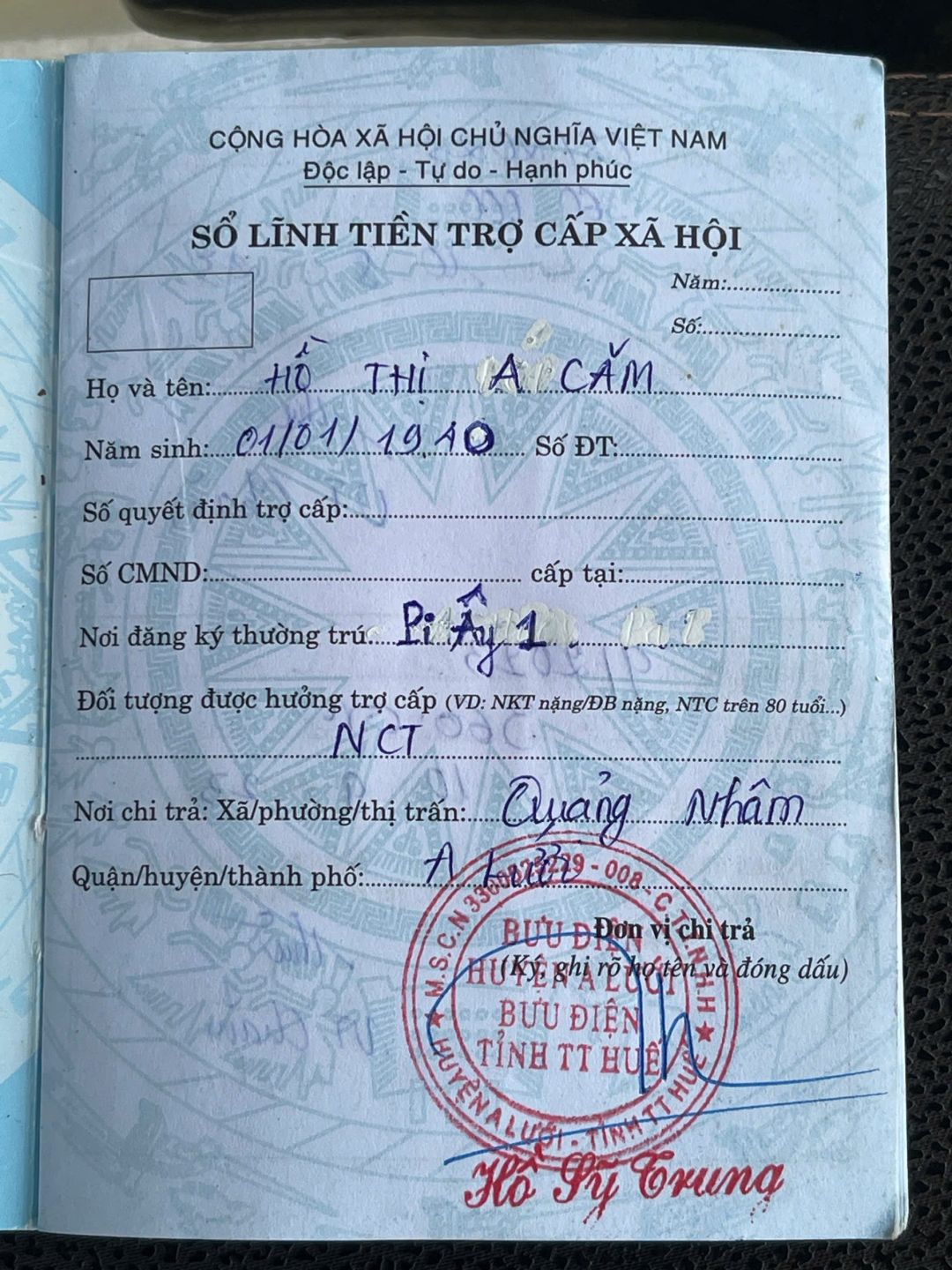 - Bà nội tên là Hồ Thị A Căm (85 tuổi). Trợ cấp xã hội hàng tháng được 500.000 đồng/tháng. Sổ lĩnh tiền ưu đãi hàng tháng được 1.565.000 đồng/tháng. Sổ huân chương/Người có công với cách mạng là 1.639.000 đồng/tháng.