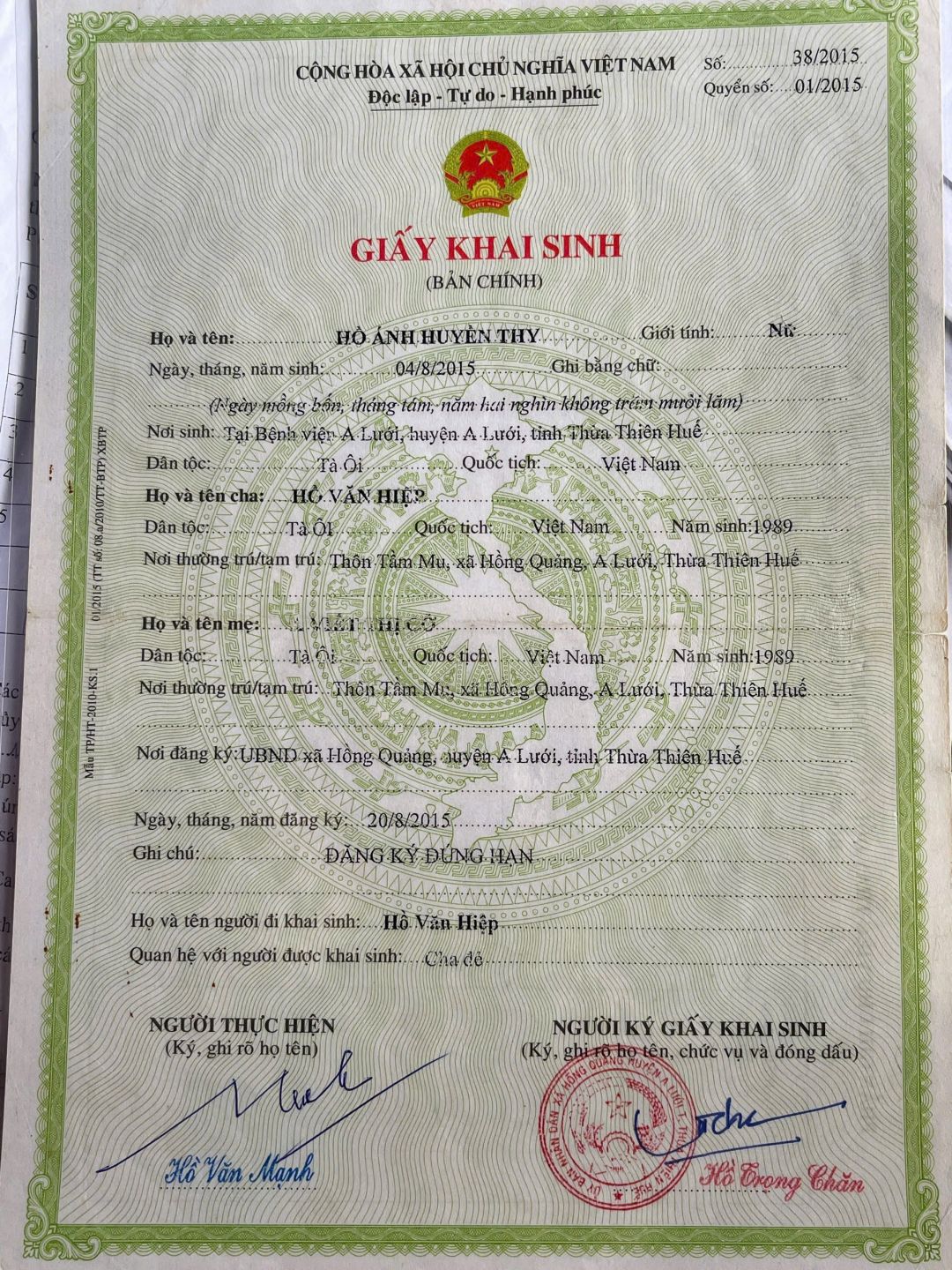 Em tên là Hồ Thị Hiêm, em xin giới thiệu hoàn cảnh của hai cháu: Hồ Ánh Huyền Thy (10 tuổi) và Hồ Ánh An Thuyên (8 tuổi) con anh Hồ Văn Hiệp không có việc làm ổn định chủ yếu làm nương rẫy, trú tại Thôn Pi Ây1, xã A Lưới 2, Thành phố Huế.