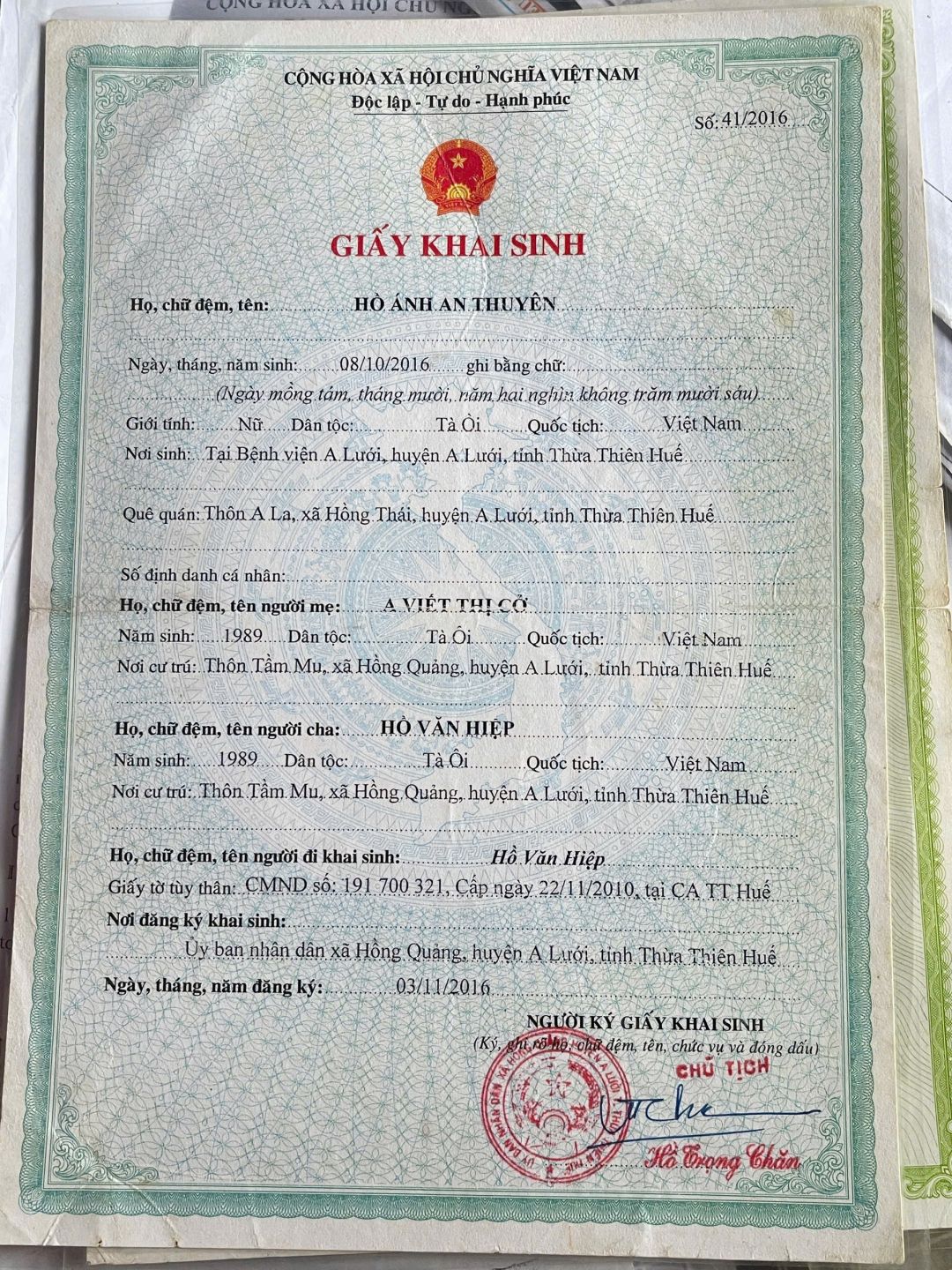 - Con thứ hai của anh Hiệp: Hồ Ánh An Thuyên, học lớp 4, Trường Tiểu học Hồng Quảng.