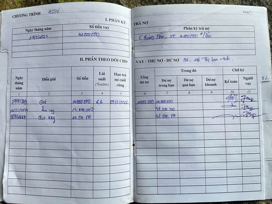 Năm 2024, gia đình sửa lại nhà ở nên đã cắm lương trợ cấp của bà nội với số tiền là 15.000.000 đồng. Mỗi tháng trả ở ngoài là: 1.639.000 đồng (cả gốc và lãi) trong đó tính lãi 2,5%/tháng. Ngoài ra, để sửa nhà và hỗ trợ cho cháu Hồ Thị Lan Anh đi học Đại học, anh Hiệp có vay thêm Ngân hàng chính sách với số tiền là 92.000.000 đồng. Mỗi tháng phải trả cả gốc và lãi từ 1.000.000 đồng trở lên.
