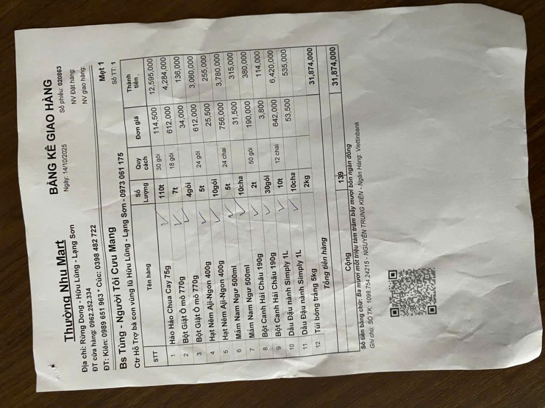 Báo cáo các Anh/Chi, cùng các mạnh thường quân. Trong ngày hôm nay 15/10/2025. Em là Bs Tùng đại diện các Anh/Chị các mạnh thường quân - NTCM và các Anh/Em Phòng khám đa khoa Quốc Hưng Thịnh - Hữu Lũng Lạng Sơn và Công ty cổ phần tập đoàn Đại Đoàn Gia - Hà Nội đã mang 130 xuất quà gửi tới bà con nhân dân Thôn Bãi Vàng, Thôn Đồng Heo, thôn Cầu Mười - xã Hữu Lũng - Tỉnh Lạng Sơn...Bà con nhân dân rất cảm động và gửi lời cảm ơn tới cả nhà mình... báo cáo anh chị hiện tại 3 Thôn này đã mất trắng toàn bộ chỉ còn căn nhà trơ chọi...