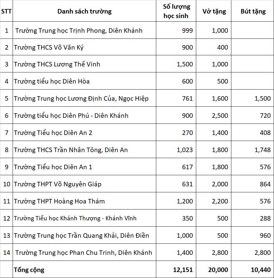 Sau khi trao đổi cụ thể với hiệu trường các trường Khánh Hòa, Thocon gửi số lượng chi tiết chăn mền và nồi cơm điện như sau: