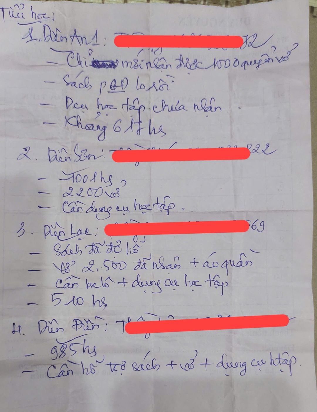 Hiện còn nhiều trường thiếu tập vở nên Vịt xin đề xuất hỗ trợ tiếp (danh sách các trường xin hỗ trợ đợt 2 hình ảnh bên dưới).