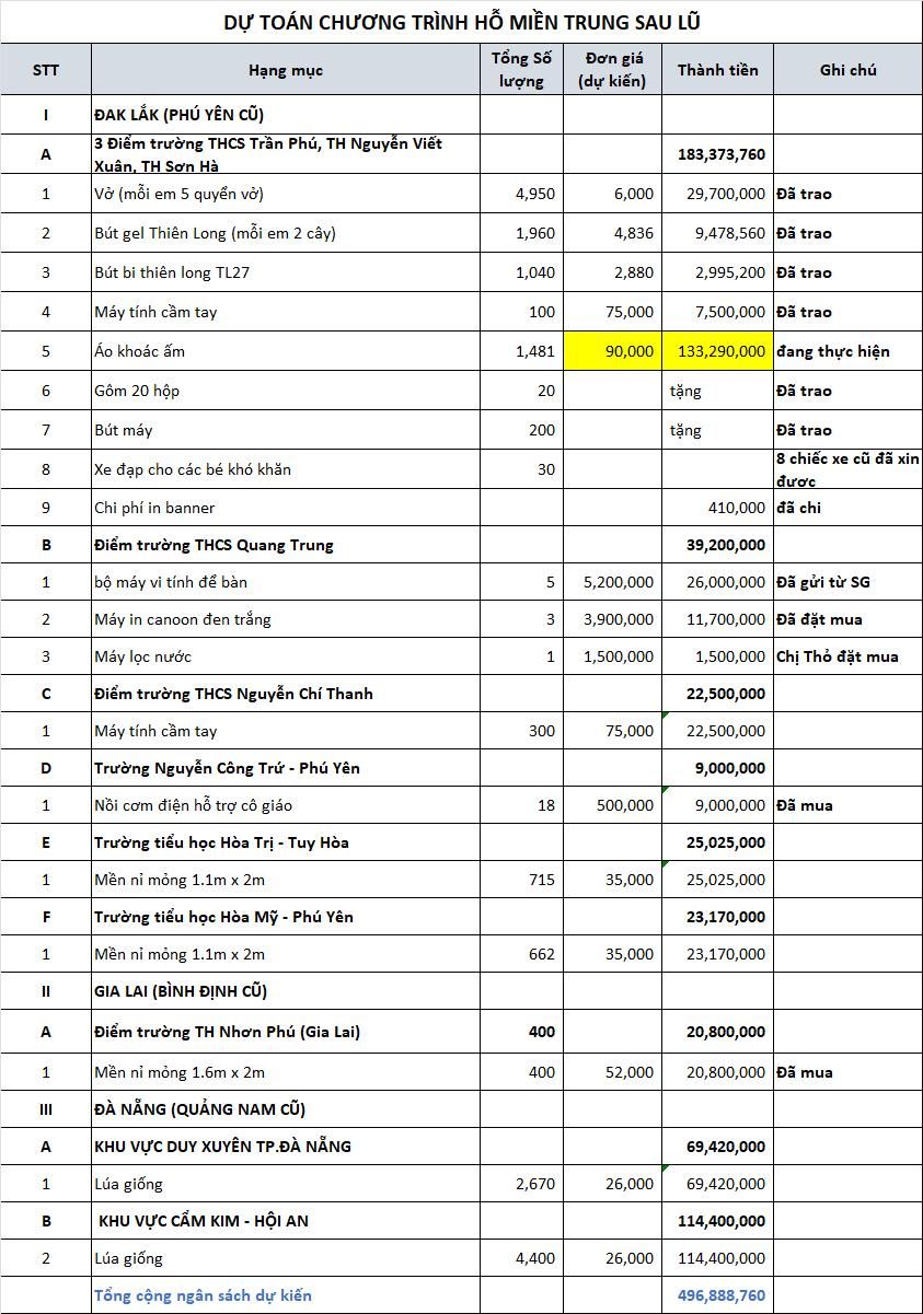Loannguyen cập nhật ủng hộ, và chi phí cho chương trình ủng hộ đồng bào sau lũ ở Phú Yên (cũ), Bình Định (cũ) và Quảng Nam (cũ)