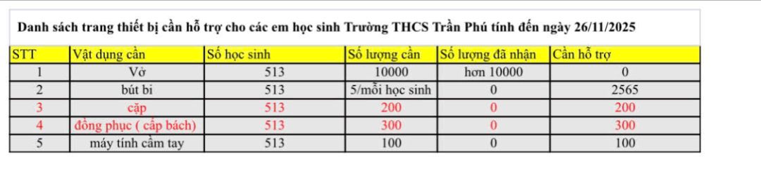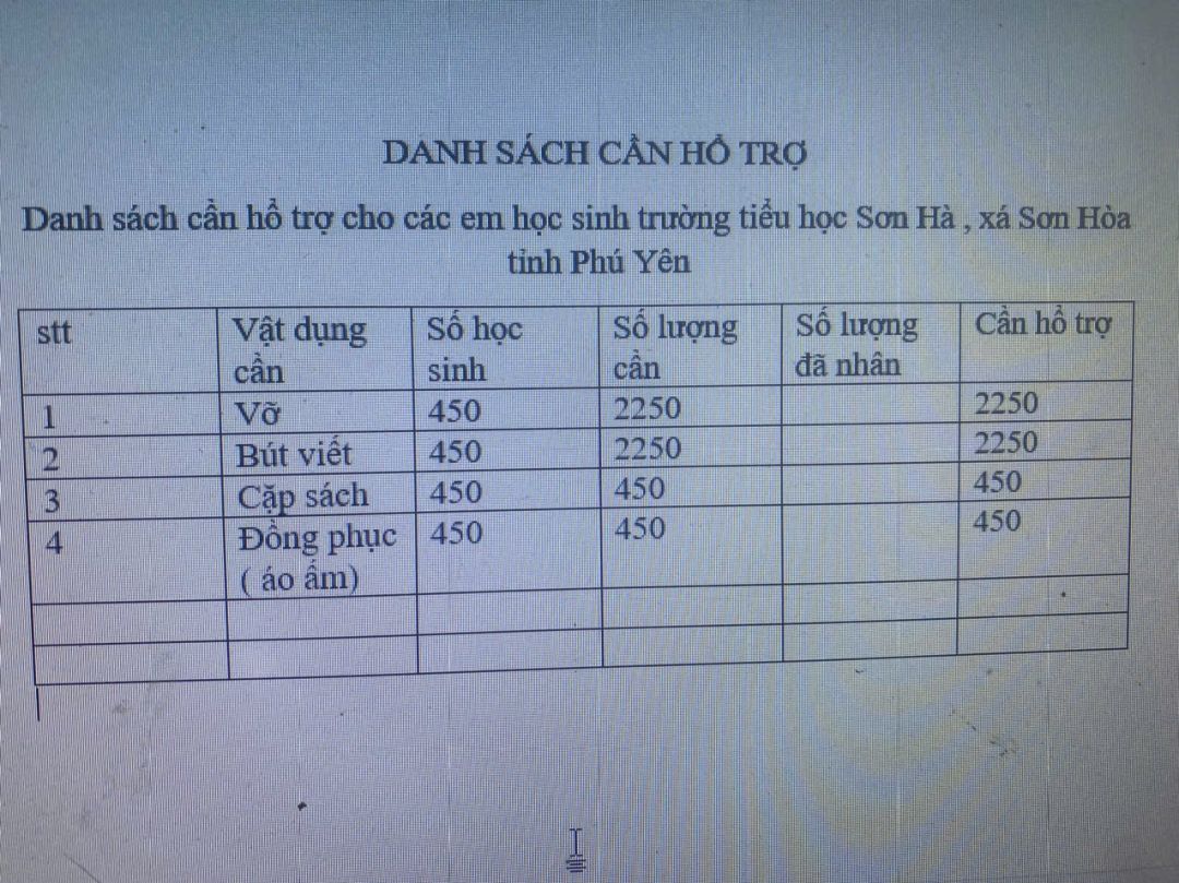 trường có nguyện vọng được tài trợ quần áo, giày quai hậu cho học sinh. Máy tính học trò (trường chỉ có 10 đến 15% em tùy lớp là mua được; có máy)Số lượng 841 học sinh. Cụ thể chi tiết như sau ..... ( Ảnh). Ngoài ra các vật chất khác (nếu có)