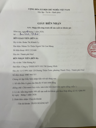 Tối nay, 20h. Khánh Ly cũng đã gặp bên công ty may và đã hoàn thiện xong hợp đồng và cọc tiền đến nhà may rồi ạ.