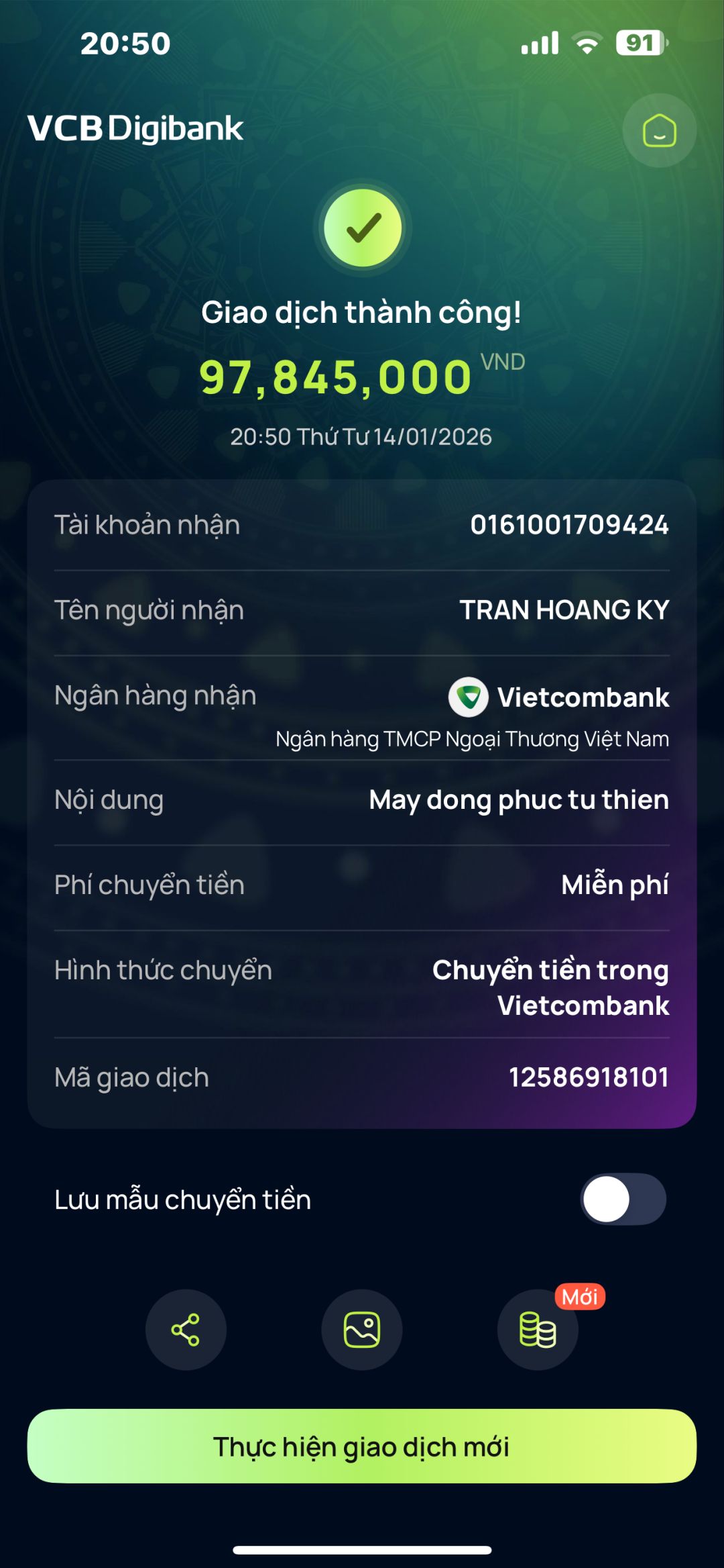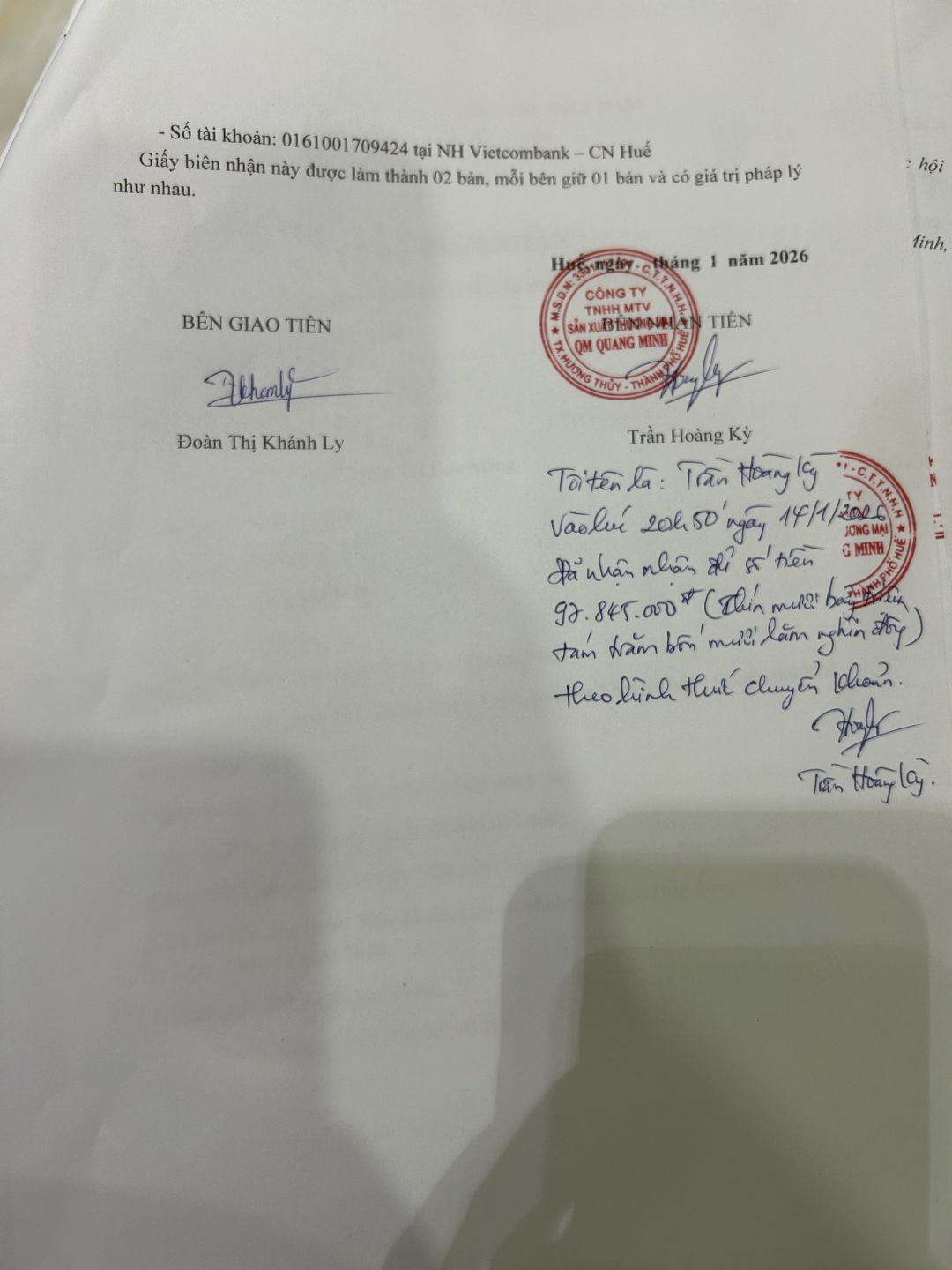 Khánh Ly đã nhận tiền 97.845.000vnd từ thủ quỹ chuyển vào tk Khánh Ly ạ.