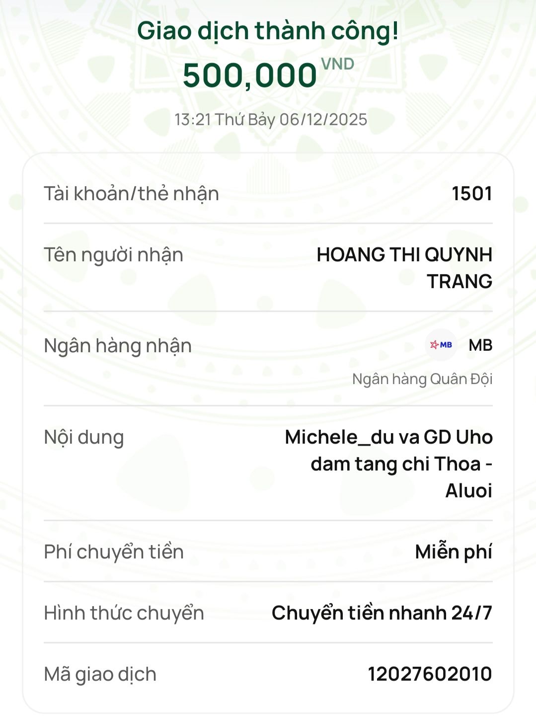 @trangvitgioi : Em chuyển thêm 500,000₫ tới @Wendy Duong để bạn ấy trao nốt số tiền ủng hộ này tới người nhà chị Thoa dùm nhé.