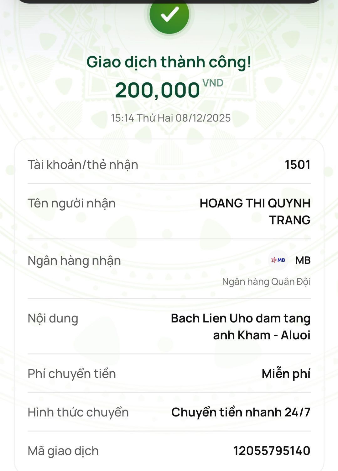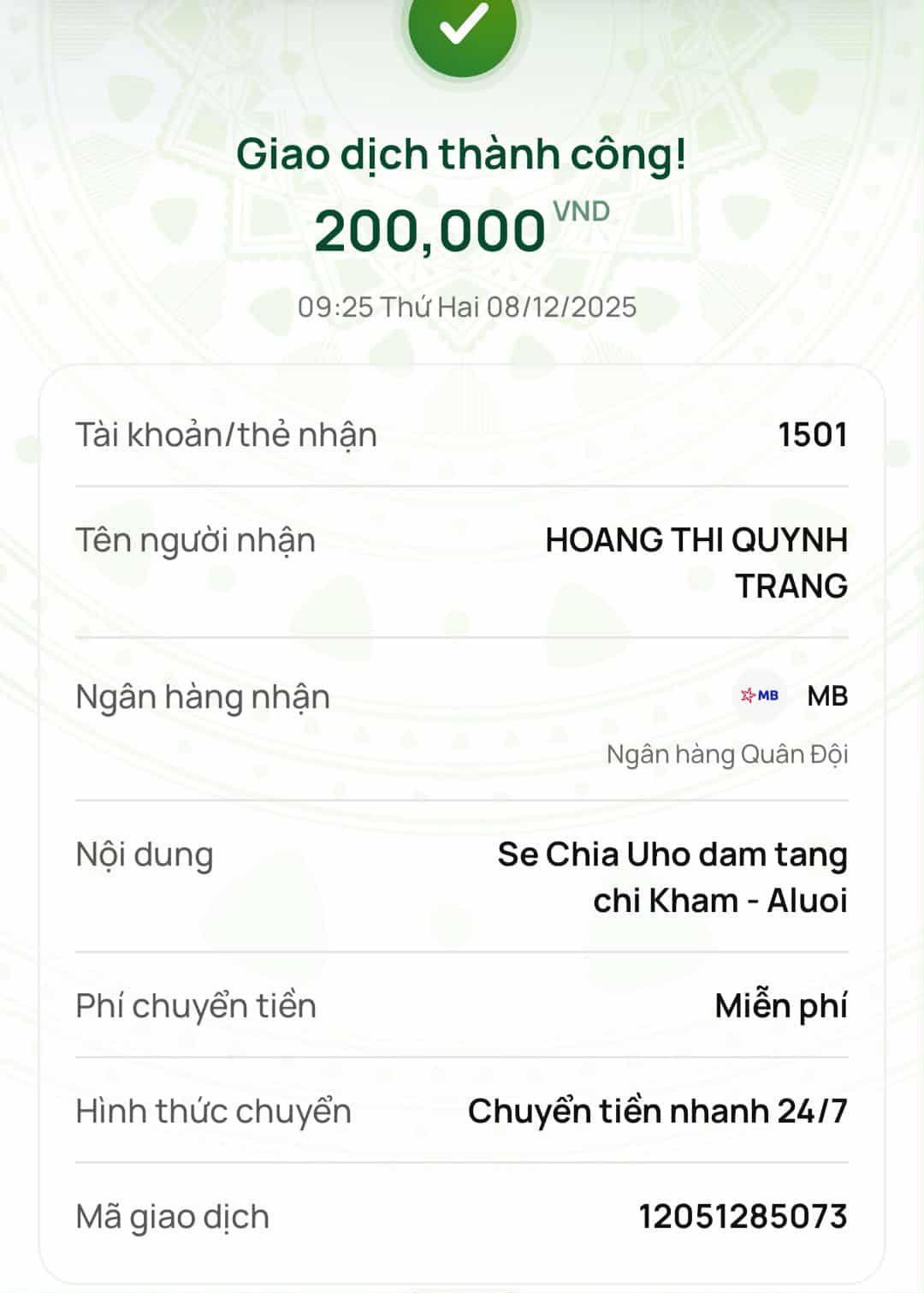 Em đã nhờ thành viên NTCM em @Ho Thuong ở địa bàn xã Hồng Thuỷ cũ đến thắp hương viếng đám em Khăm và trao số tiền 6.000.000 đ cho gia đình.