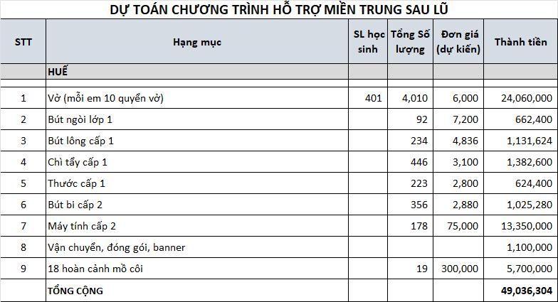Dự định để giúp cho cư dân vùng ngập của Huế, chia sẻ chút khó khăn của đồng bào, nhóm dự định tặng các em học sinh khó khăn vùng ngập ít dụng cụ học tập, đỡ gánh nặng mua sắm cho gia đình khó khăn.