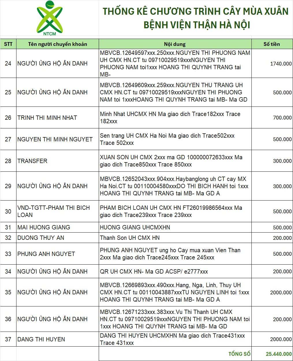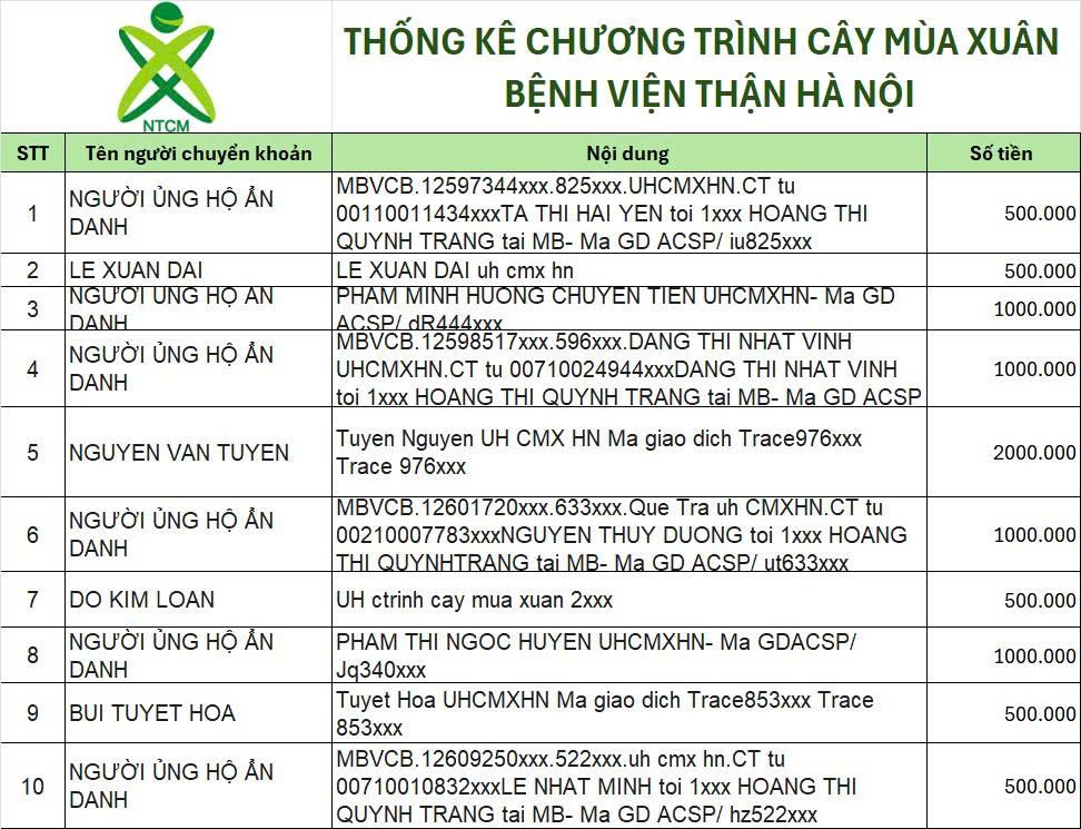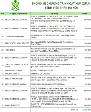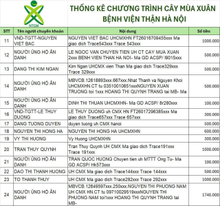 Sau 5 ngày kêu gọi, theo thống kê sơ bộ trên tài khoản 1501 . Chương trình Cây Mùa Xuân Hà Nội đã nhận được tổng số tiền là 25.440.000 VNĐ (thống kê gửi kèm)