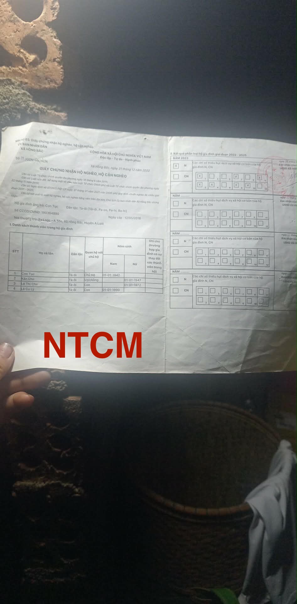 Vợ tên là Kăn Chir, sinh ngày 01/01/1947 (79 tuổi), dân tộc Tà Ôi. Già yêu đau ốm ra vào bệnh viện thường xuyên không làm được việc nặng nhọc nữa😢