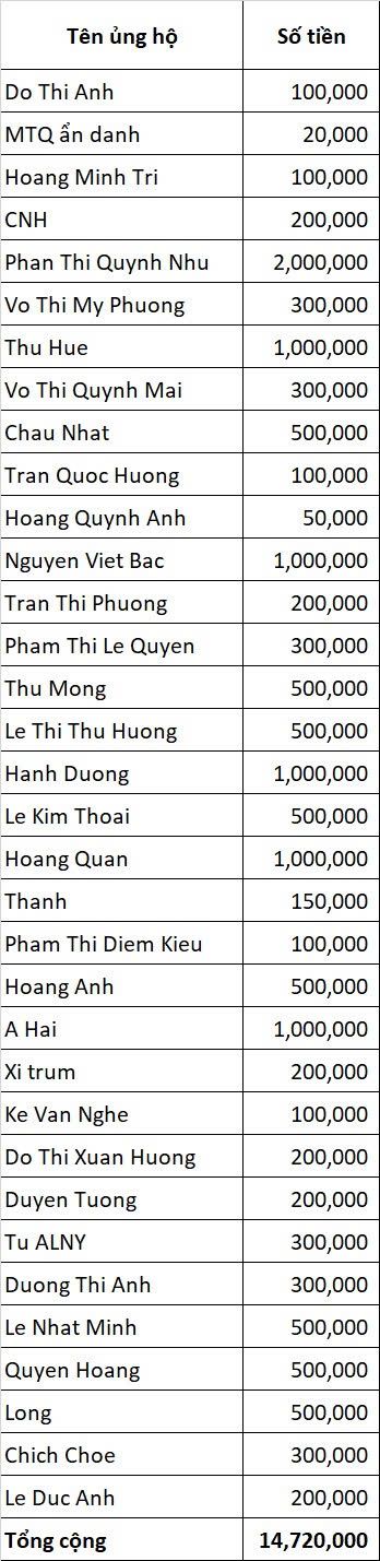 Vịt gửi thống kê ủng hộ tới thời điểm này là 14.720.000đ. Anh Banbe6x điều phối giùm em nha.